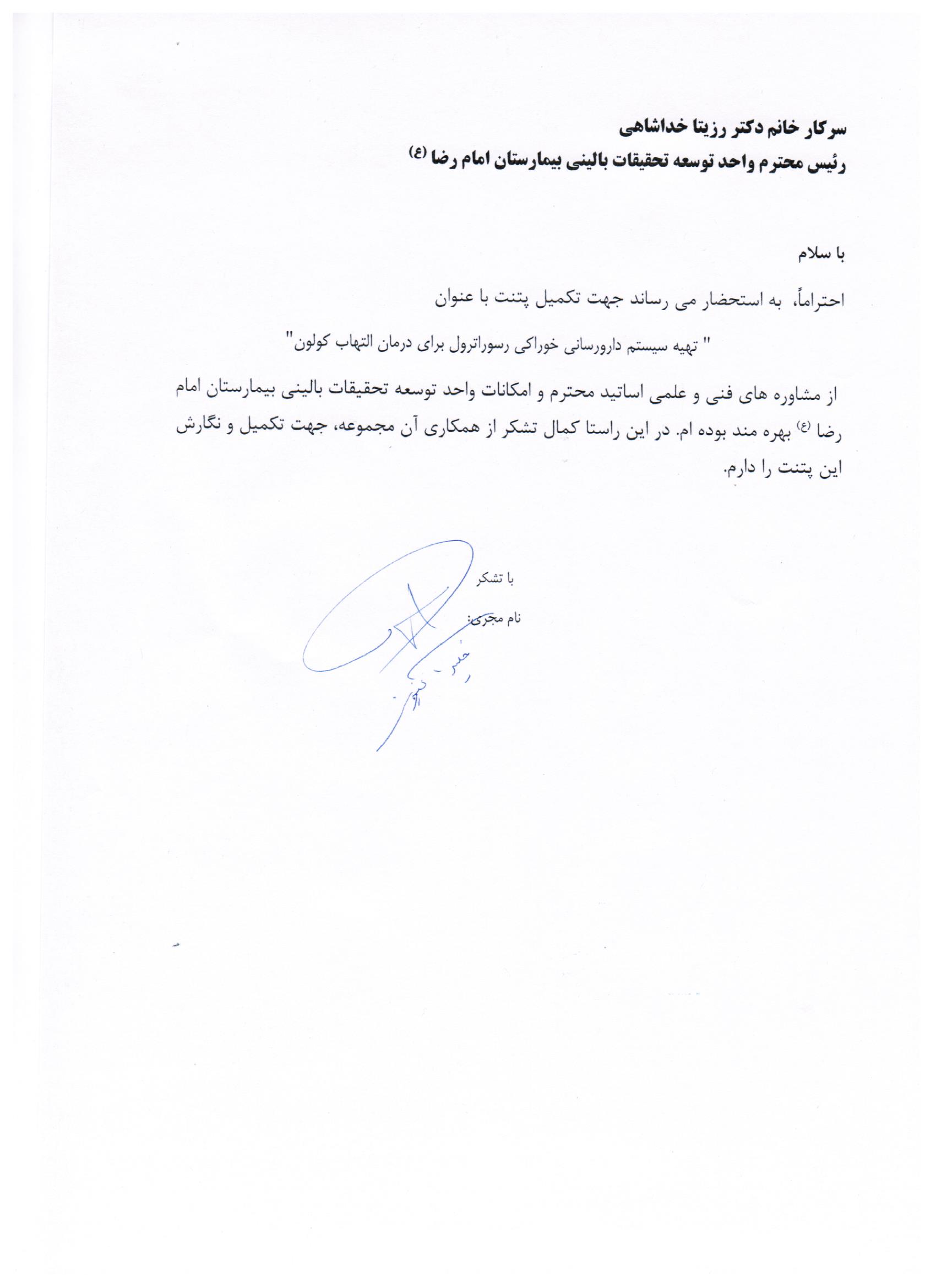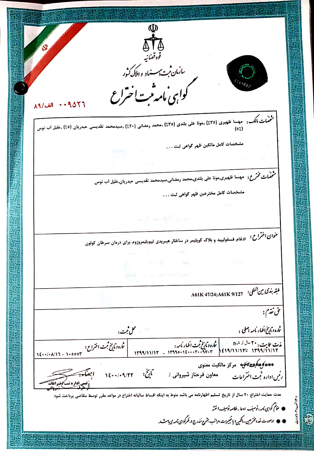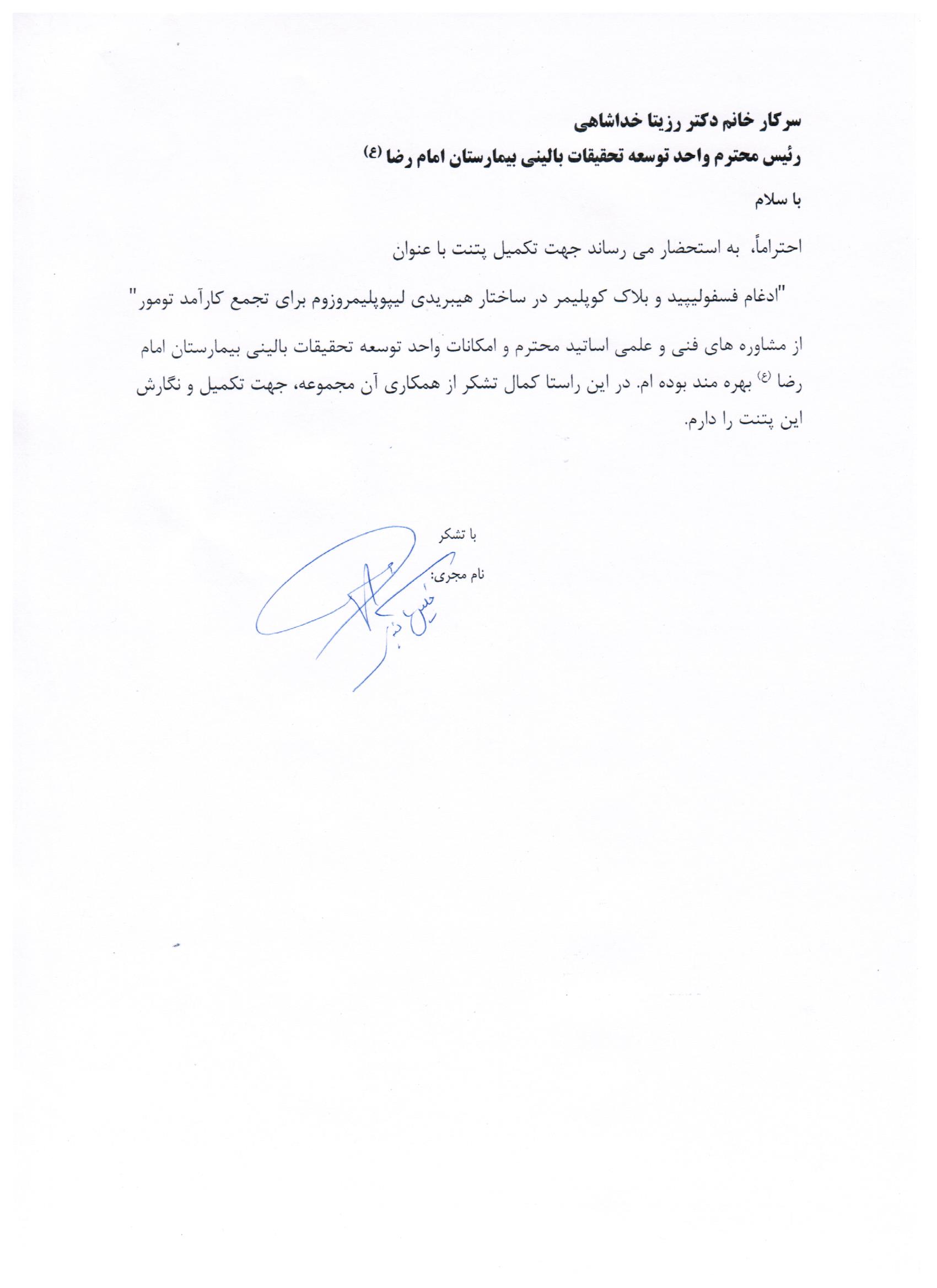 | 2 | مهشید | ناصری فر | دانشجوی دانشگاه علوم پزشکی مشهد | تهیه سیستم دارورسانی خوراکی رسوراترول برای درمان التهاب کولون | 104128 | 1400/01/16 |