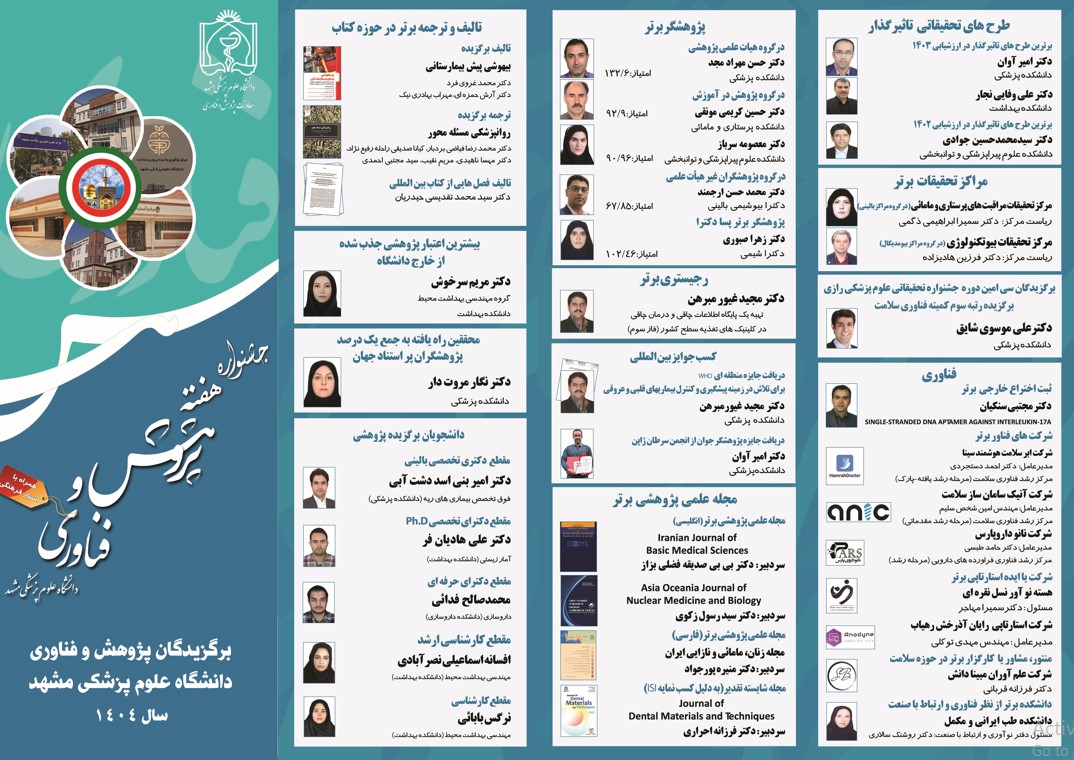 در جشنواره هفته پژوهش و فناوری دانشگاه علوم پزشکی مشهد از خانم دکتر نگار مروت دار به عنوان محقق راه یافته به جمع یک درصد پژوهشگران پر استناد جهان و از آقای دکتر سید محمد طباطبائی به عنوان پژوهشگر برتر دانشکده پزشکی تقدیر گردید.